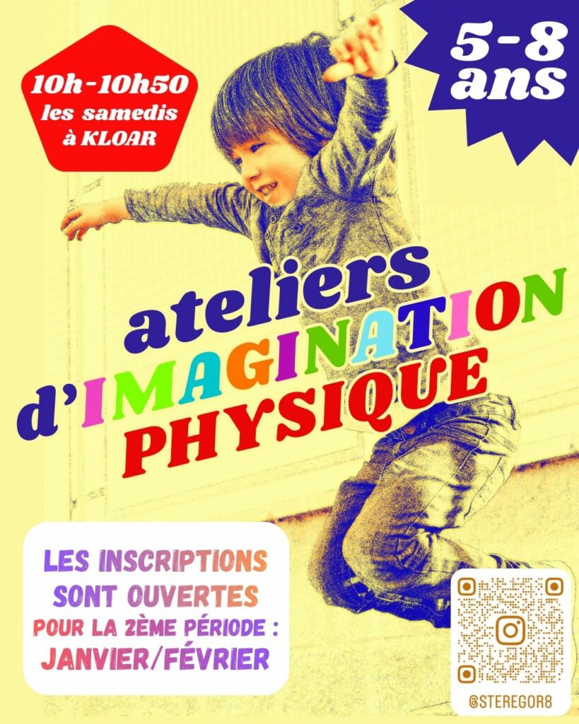 Centrés sur une pédagogie de l’espace et du mouvement spécialement adaptée à leur groupe d’âge, les ateliers d’imagination physique pour les plus jeunes ont la particularité d’intégrer aussi des éléments tels que : des objets du quotidien, de la nature, des œuvres plastiques ou des extraits de romans, des poèmes… choisis par l’intervenante ou apportés par les participants.